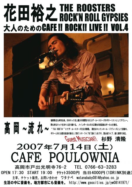 花田裕之 ソロ・ライブ 高岡 〜 流れ 〜 ”大人のためのCAFE!!ROCK!!LIVE!!” VOL4決定!!!!! 2007年7月14日(土) Cafe POULOWNIA (旧 Cafe Love Supreme) 富山県高岡市戸出光明寺76-2 TEL 0766-63-3283 OPEN pm 17:30 START 19:00 チケット 3500 円 当日4000円 (1DRINK別途。自由席と立ち見になります) ゲストミュージシャン 杉野清隆 チケット申し込みと問い合わせは watanababy0814@yahoo.co.jpもしくはmixiにて。 ソールドアウト覚悟です。 富山初ライブを高岡で。 ずっと待っていた人ば