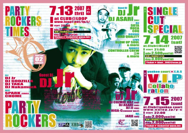 7月から始まるyankee court毎週水曜日のHIPHOPイベント『V.I.P』の決定を期に、スペシャルとして言わずと知れた東北で絶大な人気を誇るProduction『E.B.S』との記念パーティーを行う。ゲストDJにUBGからDJ Jr!!さらにEBSが誇るTopDJ達が集い、まさに最上級のコラボレーションイベントとなるのは間違いなし!!