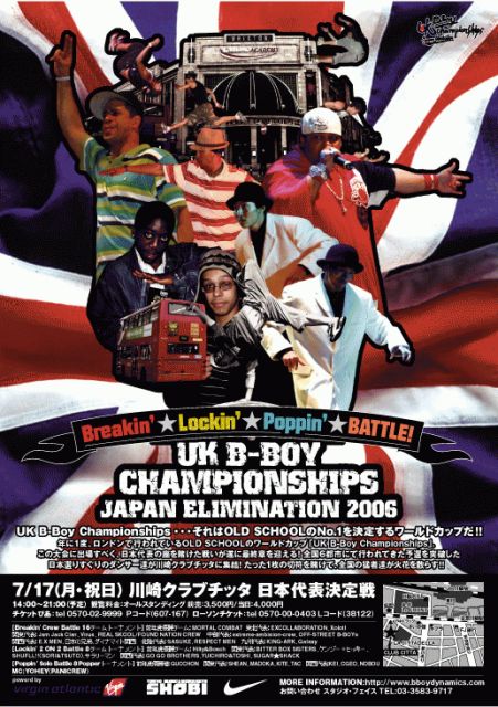 いよいよ開催が迫ってきたUK B-BOY CHAMPIONSHIPS 2006。 Breakin'、Poppin'、Lockin'とも、各地の予選を突破した猛者が7/17(月/祝日)チッタに集結! 今年度最高峰のレベルとなる事間違いないOLD-SCHOOLの一大イベント、チケットのお求めは以下よりお早めにどうぞ!! *チケット情報 ?B-Boy Dynamics オンラインショップ http://www.bboydynamics.com 03-3583-9717 ?チケットぴあ http://pia.jp:Pコード(607-167) TEL:0570-02-9999 ?ローソンチケット:http://www2.lawsonticket.com Lコード(38122) TEL:0570-000-777 B-Boy Dynamcis