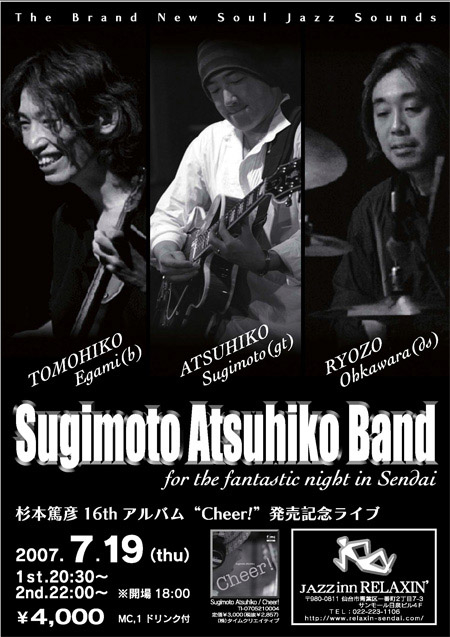 杉本篤彦 16thアルバム「Cheer!」 発売記念ライブ at 仙台 7/19(木)宮城県仙台市 Jazz in RELAXIN' http://www.relaxin-sendai.com/ 杉本篤彦バンド 杉本篤彦(gt)/ 江上友彦(b)/ 大河原亮三(ds) Open 18:00 / Start 20:30~ / MC \3000 宮城県仙台市青葉区一番町 2-7-3 ミドリビル4F Tel : 022-223-1106 仙台も僕にとってとても思い入れの深い街です。 最高のライブにしましょ〜〜〜! 添付のポスターはMckkeyさん制作です!!!
