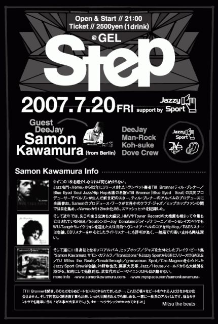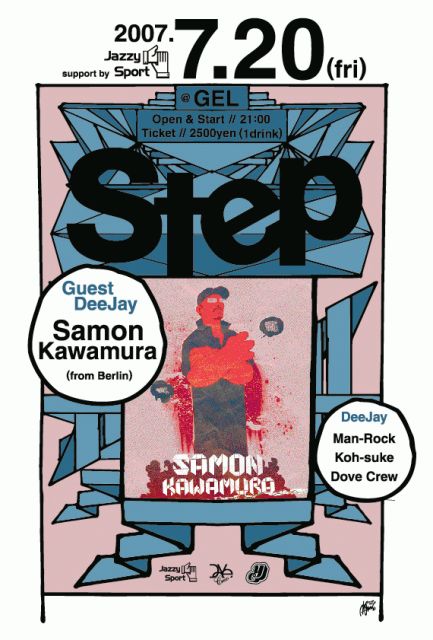 告知失礼します。 ドイツから刺客“サモン・カワムラ”を招いて送り届ける イベント“STEP”@ゲル 21:00スタート Guest DJ//Samon kawamura(from Berlin) DJ//Man-rock/Koh-suke/Dove crew Ticket//2500円(1ドリンク付き) めったにない機会ですよー、友達さそって是非!