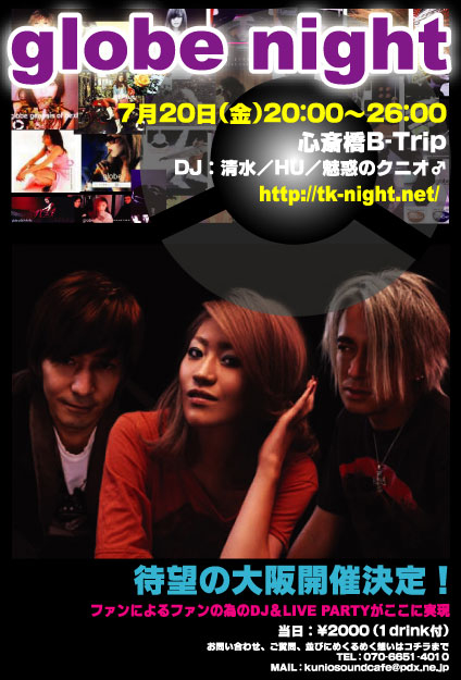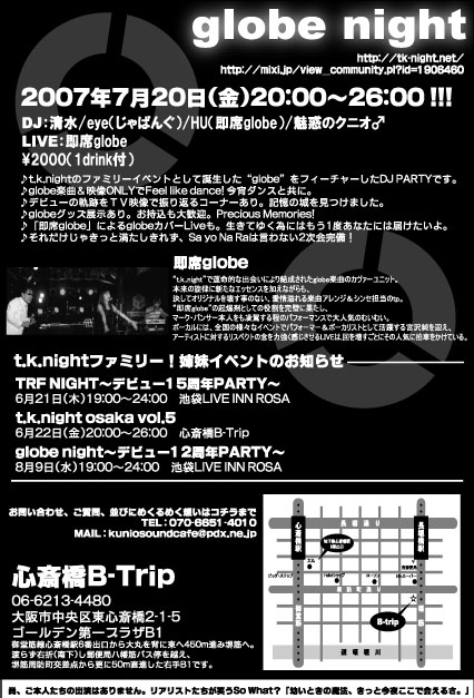 即席globe PRESENTS globe night osaka vol.1 日時:2007年7月20日(金)20:00〜26:00! ※2次会完備 会場:心斎橋B-Trip 06-6213-4480 住所:大阪市中央区東心斎橋2-1-5ゴールデン第一プラザB1 ※御堂筋線心斎橋駅6番出口から大丸を背に東へ、 450m進み堺筋へ。 渡らず右折(南下)し郵便局八幡筋バス停を越え、 堺筋周防町交差点から更に50m直進した右手B1が、 「B-Trip」です。 DJ:清水/HU(即席globe)/魅惑のクニオ♂ LIVE:即席globe 料金:\2000(1drink付) イベント公式サイト http://tk-night.net/