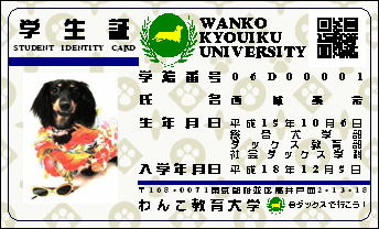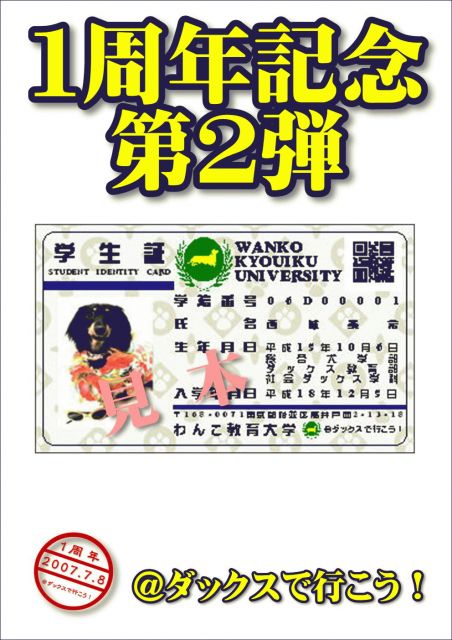 みなさんお元気ですか? 去年の7月8日に「@ダックスで行こう!」を開設して1年が経ちました☆ 時が経つのは早いものですね・・・。ジッカン みなさんのおかげで、運営も順調ですしコミュニティの内容も充実してきています☆ 現在、参加者数4690名!!を突破いたしました。 本当にありがとうございます。 これを記念して第1弾に続き、@ダックスで行こう!“オリジナル学生証”を限定20名様にプレゼントいたします☆ なお、締め切りは20日です。 応募者多数の場合は抽選となりますので、予めご了承ください。