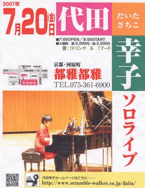 19:00 OPEN / 20:00 START 前売り:¥2000 / 当日:¥2500 入り口受付で「ヒポポ大王」という合言葉を言ってくれれば 前売り料金で入れます。 入場料とは別に 1ドリンク&1フード のオーダーが必要です 代田幸子が新譜を持って 都雅都雅へ乗り込みます。 みなさん ぜひぜひお友達をお誘い合わせの上 代田幸子の声に酔いしれませう♪♪