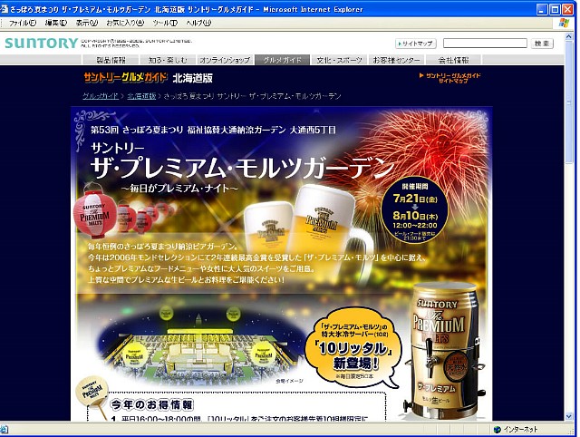 待ちに待ってたビアガーデンが始まります (*^-^)b もちろん初日から突撃 日時:7月20日(金) 夕方〜 ※去年は、結局15:00〜飲んじゃってました 場所:大通公園 5丁目 『ザ・プレミアムモルツガーデン』 去年、好評だった10リッタル君(ビアサーバー)が今年は2倍投入されることに50樽→100樽へ もう、待てねぇ〜 人数が読めないのが悲しいこの企画職権乱用しての予約も限