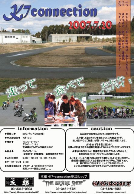昨年4回開催し、大変好評だったK7 CONNECTIONの 2007年第2回走行会の開催が決定しました。 日時:2007年7月20日(金) 申込締切日:20077月10日 場所:トミンモーターランド 〒300-0122茨城県かすみがうら市西成井280 料金:6000円(走行料金・昼食(軽食)・傷害保険料込み) お申し込み方法は ●店頭にて ●現金書留にて申し込み用紙と参加代金を送付 以上のいずれかの方法でお申し込み下さい。 送付先:〒150-0042 渋谷区宇田川町42-10-1F THE BRAKE SHOP 03-3461-5721 ご不明の点が