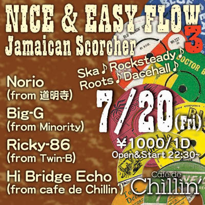 ■□■NICE & EASY FLOW Vol.3■□■ Jamaican Scorcher Ska,Rocksteady,Roots,Dancehall 7/20 22:30〜 1000/1d @NEW cafe de Chillin -Selectors- NORIO a.k.a. 道明寺 Big-G(from Minority) Ricky86(from Twin-B) Hi Bridge Echo(from cafe de Chillin') ゆっくりまったり旨いレゲエとお酒をどうぞ お暇な方は是非!