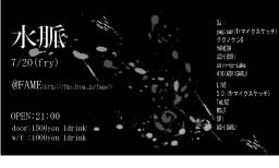 告知失礼致します。 -水脈- 2007.7.20-fri-@FAME(http://fhp.from.jp/fame/) door/21:00〜 admission/\1,500(1drink) w.f/\1,000(1drink) 【DJ】 yagisan(マイクスケッチ) テクノケンG HANEDA shin-no-suke 416(ASHIGARU) 【LIVE】 S.O. from マイクスケッチ TeL62 MSUT SPI ASHIGARU 今回から奇数月第3金曜日のレギュラーイベントとなった水脈に是非遊びに来てみて下さい。ジャンルはHIPHOP、BREAKBEATS、ABSTRACTです。