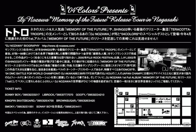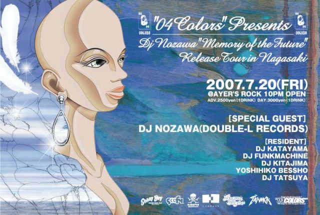 7月の"04COLORS" はな・な・何と!スタジオジブリの名作「となりのトトロ」でおなじみの楽曲 「塚森の大樹大」をサンプリングし、超大ヒットさせた名曲「MEMORY OF THE FUTURE」や、SHING02率いる 最強のクリエーター集団 TERACOTTA TROOPSの元メンバーとして知られるあの「DJ NOZAWA」氏が何とスペシャルゲストとして登場!今年4月に発表された初の1st.アルバム「MEMORY OF THE FUTURE」のリリースを記念しての来崎!これは見逃せません!!