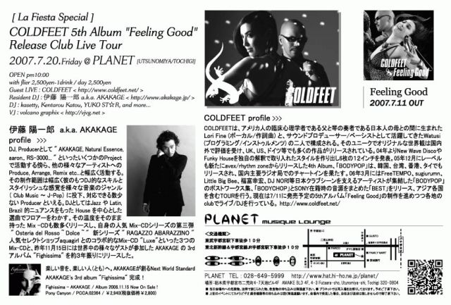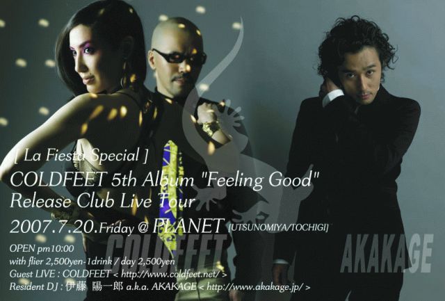 告知失礼します。 [ La Fiesta 〜COLDFEET 5th Album「Feeling Good」Release Club Live Tour〜] HOUSEMUSIC & HAPPY DANCE MUSICS OPEN pm10:00 with flier 2,500yen-1drink / 当日 2,500yen Guest LIVE : COLDFEET < http://www.coldfeet.net/ > Resident DJ : 伊藤陽一郎 a.k.a. AKAKAGE < http://www.akakage.jp/ > DJ : kasetty, Kentarou Katou, YUKO ST☆R, and more... VJ : volcano graphix < http://vjvg.net > 愛の4つ打ちDJ 伊藤陽一郎 a.k.a akakage氏をレジデンツに 行われているhouseイベント「La Fi