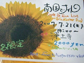 ぱらぱらと… ときに ばらばら・ばらばらと、やまない雨の毎日です。 今治でスティールパン&ガットギターのライブを行います。 『南国でナイト♪』 日 時:2007年7月21日(土) 19:00〜 場 所:今治市浄土寺→蒼社川にかかる橋(郷橋)を越え パチンコロッキーの前にあるお寺です。 料 金:2,000円♪お茶飲んでいってね♪ スティールパン演奏者 伊沢 陽一(かなりさわやかな男前♪) 14歳の頃SteelOrchestraレネゲイズを見て衝撃を受け スティールパンへの片想いが始まる。 (私は伊沢さんの写真を見、彼