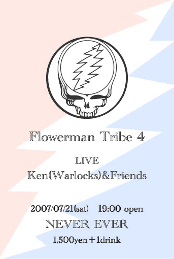ども、毎度お世話になってます。 Flowermanのテツジです。告知させてください。 今年からはじめたイベントTribeも早くも4回目です。 今回は日本最強のGRATEFUL DEADトリビュートバンド "Warlocks(ワーロックス)"のリードギター&ボーカル ケンちゃんがフレンズをと共に登場です! とろけるギターをご堪能ください。 Flowerman Tribe 4 日時:2007/07/21(土) 19:00 open 場所:NEVER EVER 群馬県高崎市中大類町421-14 料金:1,500円+1drink 出演:Ken (Warlocks) & Friends PA:happyman MC:潤