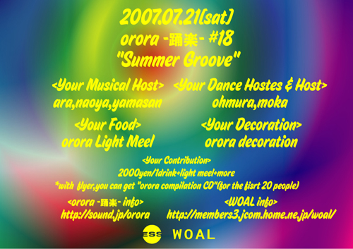 2007/07/21(sat)*every 3rd saturday* orora -踊楽- #18"Summer Groove " @WOAL -Music- ara naoya yamasan -Floor- ohmura moka & you -Food- orora light meel -Fee- 2000yen/1drink+original CD(for the fisrt 20 people)+light meel+good music orora compilation CDはフライヤーを持参した方のみ先着で差し上げております。 UREi+DOPE REAL最強コンビ投入!