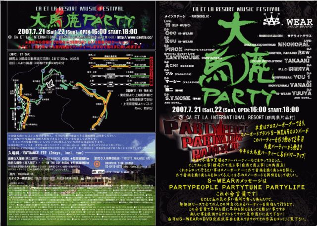 管理人さん 失礼します。 7月21日22日群馬サエラスキー場で4ヶ月ぶりに大馬鹿PARTYをします!!! しかもこの4ヶ月を経てFREE PARTY RAVEから完全なスキー場でやるRAVE PARTYになりパワーアップ!!! 今まで1年間FREEの馬鹿PARTYで学んだ事や元々S-WEARの原点にある来た人たちにどれだけ楽しんでもらうか?というテーマそのままに、今までに無いRAVE PARTYを開きます! 例えばRAVEって言うと風呂に入れないから嫌だ!という人、スキー場内のホテルが通常の40パーセントオフで止まれる(要予約詳しくはHPまで) 再入場可!駐車場無料