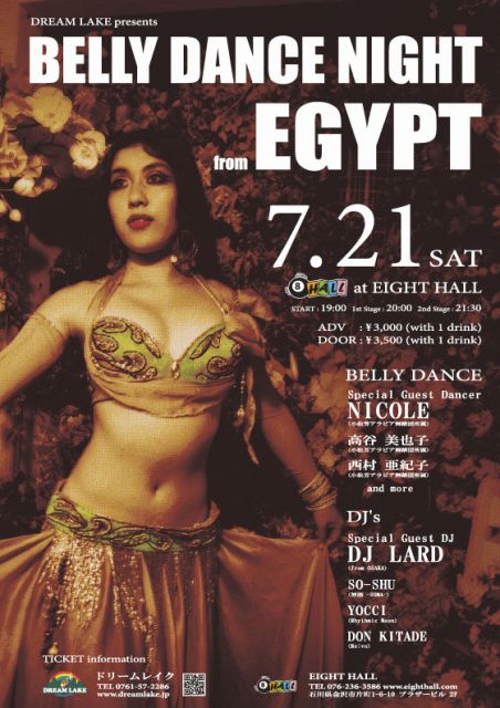 金沢でエジプトの風薫るライブ開催です!! 世界中から毎年2000人以上がエントリーする ベリーダンスの一大イベント「AHLAN WA SAHLAN」 そのカイロ・フェスティバルからの帰国直後 興奮醒めやらぬままに、ここ金沢へ・・・ ダンサーがフェスティバルで感じたすべてを解き放ち エジプトの風をあなたに届けます DREAM LAKE presents ★BELLY DANCE NIGHT from EGYPT★ 7月21日(土)19時〜 1stage:20時 2stage:21時半 前売・予約3000円/当日3500円(1drink付) 会場:EIGHT HALL(金沢片町 076-236-
