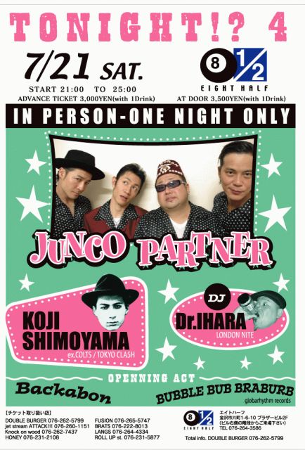 〜『TONIGHT !? 4』〜 【日時】7/21(土) OPEN 21:00 【料金】前売り¥3,000-(1ドリンク付) 当日\3,500-(1ドリンク付) 【場所】8HALF(エイト・ハーフ) 石川県金沢市片町1−6−10 ブラザービル2F TEL 076−264−3586 【DJ】Dr,IHARA(LONDON NITE) 【LIVE】JUNCO PARTNER KOJI SHIMOYAMA(ex,COLTS、TOKYO CLA5H) BACKABON BUBBLE BUB BRABURB 【チケット取り扱い店】 DOUBLE BURGER 076-262-5799 jet stream ATTACK!!! 076-26