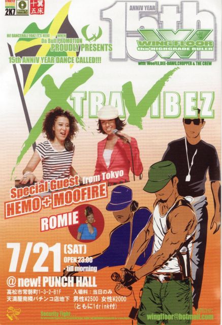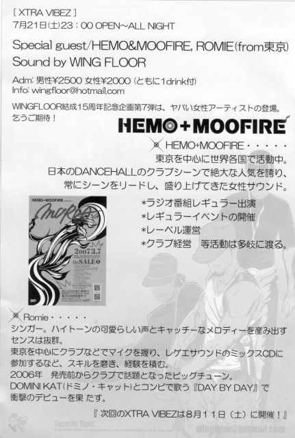 【XTRA VIBEZ】 2007.7.21 sat 23:00Start-All night Special guest/ HEMO&MOOFIRE ROMIE (from東京) Sound by WING FLOOR Adm/ 男性 2.500yen(1d) 女性 2.000yen(1d) info/ wingfloor@hotmail.com WING FLOOR結成15周年記念企画! 第七弾は、ヤバいアーティストの登場。乞うご期待! About guest/ ■HEMO&MOOFIRE 東京を中心に全国で活躍中。DANCEHALLのクラブシーンで絶大な人気を誇り、 常にシーンをリ-ドし、盛り上げてきたDANCEHALL CREW。 2001年それまでお互いが培ってきたことを生かす形で結成。レギ