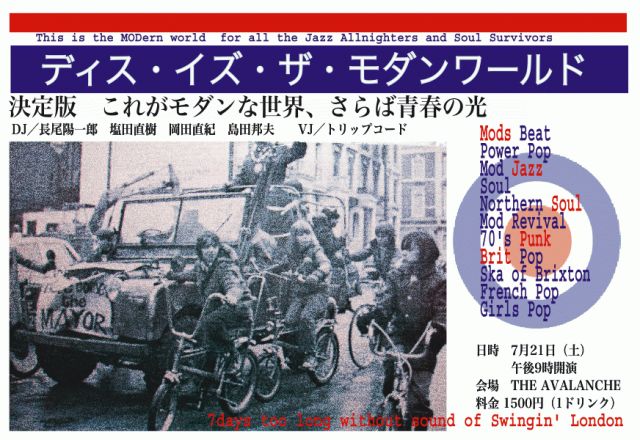 今、あえてこの時期にやりますよ、モッズの祭典!! 高松では、久しくなかったと思われるモッズ・イベント。 瓦町が、若いソウルとモダンマインドに支配される夜。ぜひ。 E/F: 1500yen ( with 1 drink ) ジャンル: MODS BEAT,POWER POP,MOD JAZZ,MOD SOUL,NORTHERN SOUL,MOD REVIVAL,70'S PUNK,BRIT POP,SKA,FRENCH POPS,GIRLS POPS DJ: 長尾陽一郎、塩田直樹、岡田直紀、島田邦夫 VJ: 仲西康輔 会場:THE AVALANCHE(瓦町ビル4F) http://maps.google.co.jp/maps?ie=UTF-8&oe=UTF-8&hl=ja&tab=wl&q=
