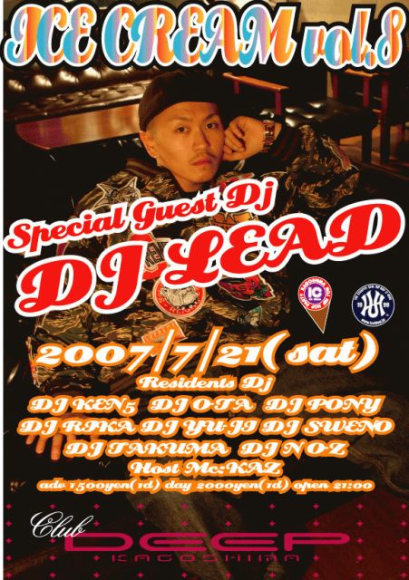 ハイ!!!いよいよ7月突入!!!夏です!!!まだ雨ばかりでなかなか天気よくなりませんが!!!今月で7回目の“ICE C.R.E.A.M.”@ CLUB DEEP!!!今回はSPECIAL GUESTにREP'京都、REP' R-RATED!!!DJ LEADを迎えマス!!!見逃し厳禁!!!今一番関西を中心に見逃せないDJです!!!是非お越しクダサイ!!!待ちしてまーす!!!