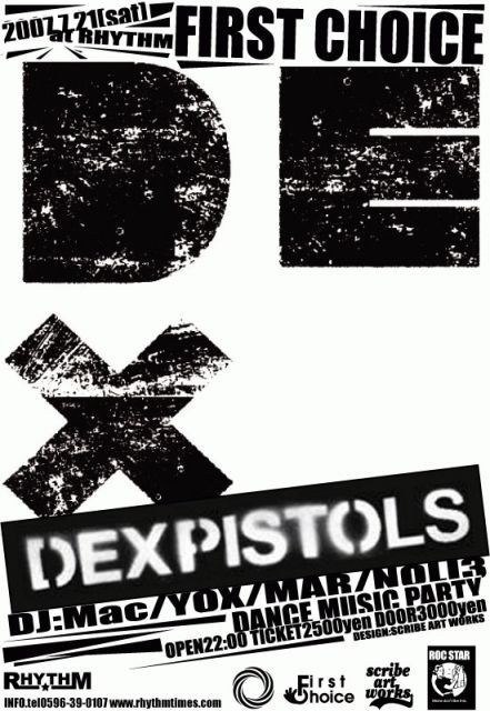 2007.7.21 夏!!! @伊勢RHYTHMにて今回のゲストはDEX!!!!!!!!!!!!!!!! □出演 DEXPISTOLS DJ mac/YOX/MAR/NOLI3 VJ SENTO 時間:22:00- 料金:前売2500円 当日3000円 *注意 毎月FIRST CHOICEは第4土曜ですが、、 この7月だけは第3土曜になっておりますので、、 ご注意を。。 □DEXPISTOLS □□□□□□□□□□□□□□□□□ DEXPISTOLS(DJ DARUMA+DJ MAAR) 200X年、進化したテクノロジーにより 東京ストリートカルチャーシーンが生み出した 2ピースDJバンド"DEXPISTOLS" BPM123~140前後のEle