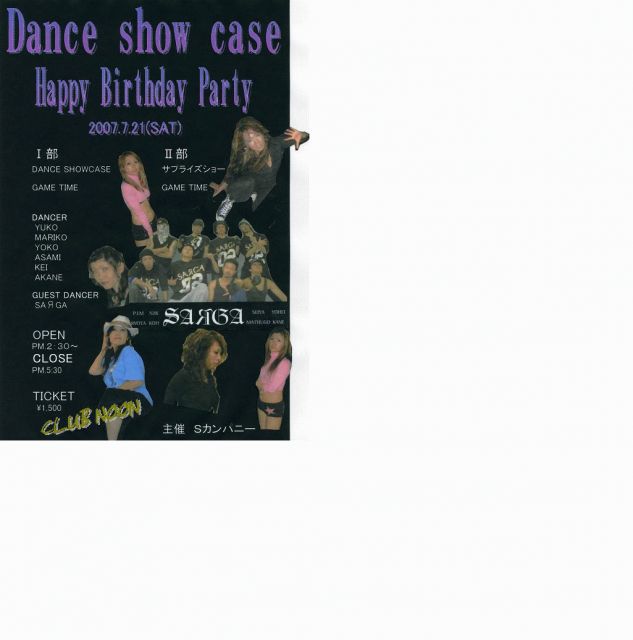 CLUB NOON OPEN PM.2:30〜 TICKET ¥1,500ドリンク別 子供、¥1,500ドリンク付き dance&サプライズショー&ゲームなどなど 楽しいPARTYにしたいので みなさん、ぜひ遊びに来て下さい その後、打ち上げを 某居酒屋で行ないます 予定では、PM6;00〜となっております 出演メンバー以外、観に来てくれた方も参加OK〜なので 予約の方は、7月6日までにお願いします ぜひ、打ち上げ参加したいって方は こちらに書き込んで下さいね〜! イベントの方は、予約なしで直接来て頂いても結構です たくさ