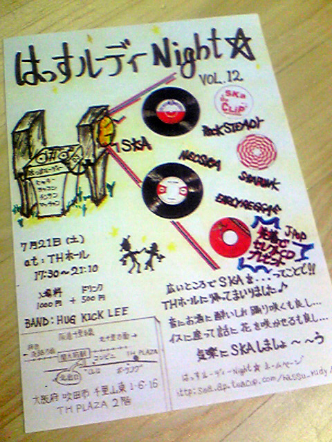まいどー!はぐはぐミチィです。 ハグキックリー、ライブ情報を紹介しますー ついに、待望の新曲投入か!? 1ヶ月後、真相が明らかに… -------------------------------------------------- 関大前THホールでの超健全タイムな アットホームパーティーです♪ SKAな音に酔いしれ 揺れるも良し、踊り咲くも良し。。。 イスに座って飲んだり話したり落ち着くも良し。。。 テーブル&イス、オモチャも多数用意してますので、 いろんな楽しみ方できます♪ 広々とした空間でフリーに楽しみましょ〜! 友達も呼んでくれ