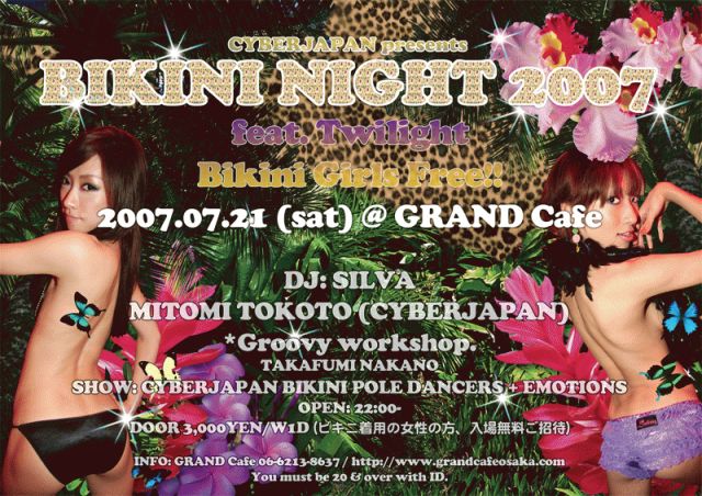 東京を始め、大阪、名古屋、京都で開催されて来たBIKINI NIGHTの2007年第2弾の大阪ビキニナイトは、7/21(土)GRAND Cafeにて開催決定。 第一回目のBIKINI NIGHT 2007も、興奮度MAXの盛り上がりの内に終了。続く第二弾は、スペシャルゲストにDJ SILVAを迎えます! 国内にとどまらず、アジア各国でも大活躍、2007年にはKings Streetより世界リリースを7/30にひかえ、ますます要注目の女性DJ。さらに、IBIZA HOUSE全開のMitomi Tokoto、大阪を代表する*Groovy Wrokshop.もアッパーハウスでフロアーを盛り上げます!勿論、今回もビキニナイト恒例ビキニの
