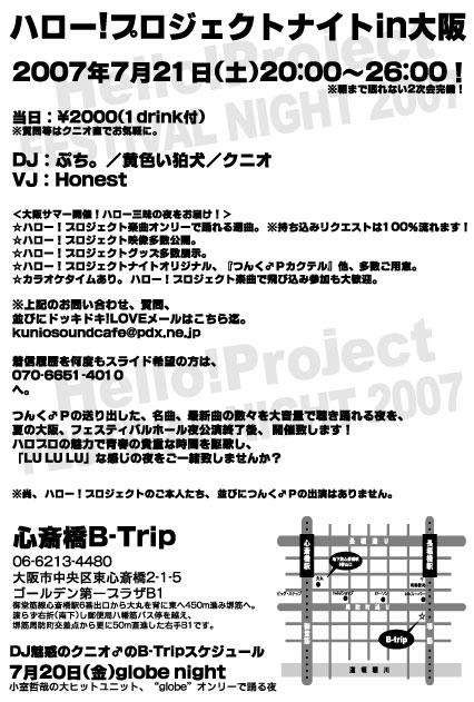 お世話になっております。 新旧ハロー!三昧の夜をお届けする、 “ハロー!プロジェクトナイト”の、 サマーフェスティバルのお知らせです。 大阪の夏の夜を最高潮の温度で過ごしましょう! “ハロー!プロジェクトナイトin大阪” 日時:7/21(土)20:00〜26:00! ※朝まで眠れない2次会完備! 会場:心斎橋B-Trip 06-6213-4480 住所:大阪市中央区東心斎橋2-1-5ゴールデン第一プラザB1 http://ayayanight.fc2web.com/next/images/img-btrip_map.gif ※御堂筋線心斎橋駅6番出口から大丸を背に、 東へ450m進み、堺筋へ。 渡