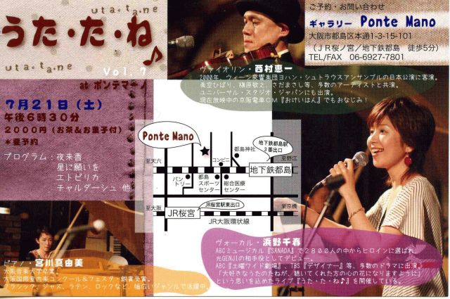 うた・た・ね♪がなんと大阪で開催されます! ☆会場 ギャラリー ポンテマーノ (JR桜ノ宮、地下鉄都島より徒歩5分) 大阪市都島区本通1−3−15−101 06−6927−7801 http://yousworld.com/shop&spot/htm/179.htm ※アットホームな空間で、お茶とお菓子付きのライブです。 お席に限りがありますので、必ずご予約下さい! 木、ガラス、陶器、布、絵、ハーブ、天然素材のウェア、アクセサリー、置物などなど、 「手」をかけて「感性」で作った一点ものが多いお店で