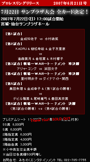 【第1試合】 金成知佐子 vs 水村綾菜 【第2試合】 KAORU & 植松寿絵 & 金子友里恵 vs 遠藤美月 & 倉垣翼 & 木村響子 【第3試合】戦場-WAR-トーナメント 準決勝 アジャ・コング vs 浜田文子 【第4試合】戦場-WAR-トーナメント 準決勝 里村明衣子 vs ダイナマイト関西 【第5試合】 奥田朱理 & 金成幸子 & (第1試合の勝者) vs デビル雅美 & 尾崎魔弓 & 豊田真奈美 【第6試合】戦場-WAR-トーナメント 決勝 (第3試合の勝者)vs(第4試合の勝者) ■プレミアムシート(最前列) 【完売