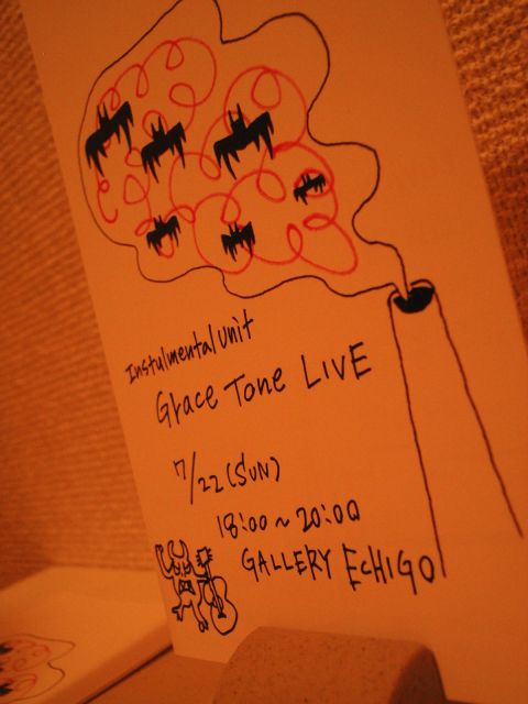 Gallery Echigoにてのコンサート。 現在、個展開催中の[LOW TECH KING]とのコラボ。 GRACEtoneからの要望で実現したこの空間を楽しんでください。 なお、ギャラリーに入れる人数には限界がありますので(十数人?)、お越しの際は念頭に。 車も。 ギャラリー越後: http://www.onyx.dti.ne.jp/~geg/ LOW TECH KING: http://www5d.biglobe.ne.jp/~king-tv/