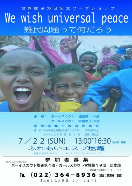 実際に難民活動に参加してきた方の講演と、難民生活の一部を体験し、難民問題について少しでも理解を深めようという内容になっています。 ボーイスカウト塩釜第4団とガールスカウト宮城第19団の共催で今年で4回目になります。 講師もUNHCR東京事務所とガールスカウト島根第4団より来ていただくことになり、内容の濃いものになるのではと思います。 難民について興味のある方は、ぜひご参加いただければと思います。 お問い合せは私の方までお願いいたします。 お申込みは私か、ポスターの募集先(団本部)の方までお願いいたしま