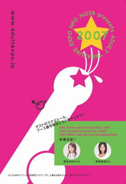 NPOノアール プレゼンツ Vol.32 熊篠福祉専門学校エロ学部@アダルトトレジャーエキスポ 日時:7月27日(金)〜29日(日) 教室:幕張メッセ 9・10・11ホール ※ノアールブースナンバーは「Bー09」 学費:障害者(介助者1名まで)入場無料 全体の内容の詳細は、下記ATEサイトをご覧下さい。 「ADULT TREASURE EXPO 2007」公式HP http://adultexpo.jp/main.html ノアール独自の企画は随時追加・更新していきます。
