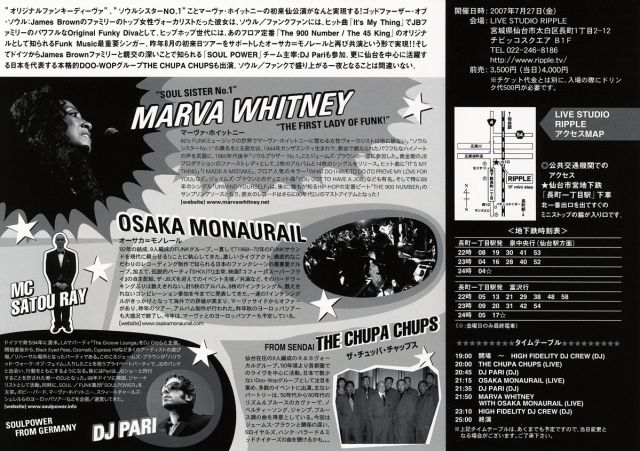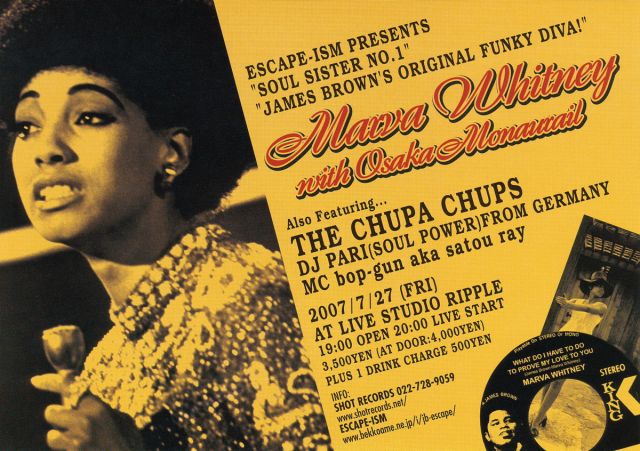 というわけで、あと一週間となってしまいました。THE CHUPA CHUPSにも出演頂く、マーヴァ・ホイットニーのライヴでございます。当日のTHE CHUPA CHUPSはブラウン関連の曲も演奏する可能性もあるとのこと。楽しい一夜になることは間違いございませんので、皆様宜しくお願い致します。