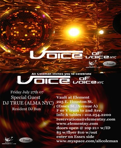 今回のVoice of voice NYCではゲストDJに、Louie Vega And The Elements Of Life,Joe Claussell,Osunlade等ルーツ系のアーティストを招いてきたNYCの名物パーティー"ALMA NYC"より、DANNY KRIVITのパーティー"718SESSIONS"にも頻繁にゲストDJとして招待されているDJ TRUEが登場です。"ALMA NYC"は日本ではまだあまり知られていないとは思いますが、NYを代表するハウスパーティーのひとつとして知られています。現在FRANCOIS K主催のWAVE MUSICよりパーティーの模様を再現して、ラウンジ・スタイルからクラブ仕様の楽曲ま