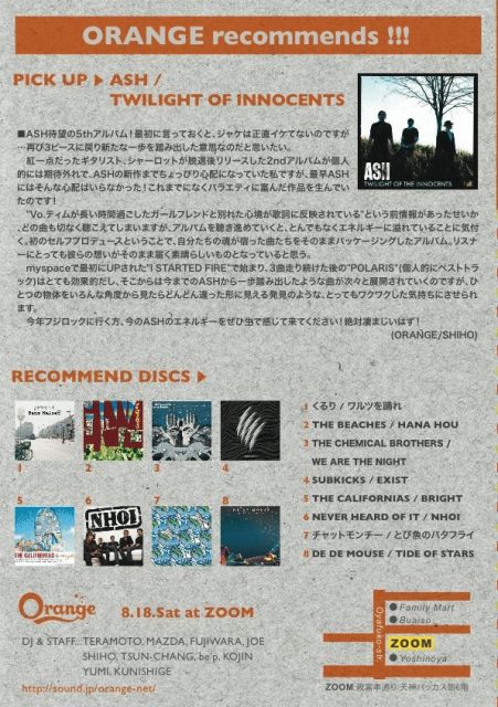 8月のOrangeも、夏フェスに負けないくらい、熱くて楽しい夜をお届けします♪ 特に、FUJI ROCK帰りのTERAMOTO、MAZDAのDJには要注目です。フジみやげもあるかも???? ☆Orange☆ 8.18.sat ...at CLUB ZOOM (福岡親富孝通り) (1500yen <with 1drink & compiled CD> open/start 21:00 DJ&STAFF… TERAMOTO, MAZDA, FUJIWARA, JOE, SHIHO, TSUN-CHANG, be'p, KOJIN, YUMI, KUNISHIGE リクエストもお待ちしてます!フェス参加者の思い出話なんかも書き込んでください☆
