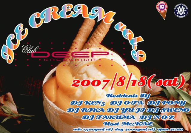2007年1月からSTARTした毎月第3土曜日、鹿児島の夜を騒がしている“ICE C.R.E.A.M.”!!!鹿児島の夜を代表するDJ達がフロアを騒がせる!!!新譜や流行の曲をいち早くCHECK出来るのはもちろん 、新旧HIP HOP、R&Bを中心に間違いない選曲でフロアをロック!!!これぞまさに鹿児島#1 HIP HOP PARTY!!!毎月第3土曜日はclub DEEP"ICE CREAM"に集合!!!決まりです!!!