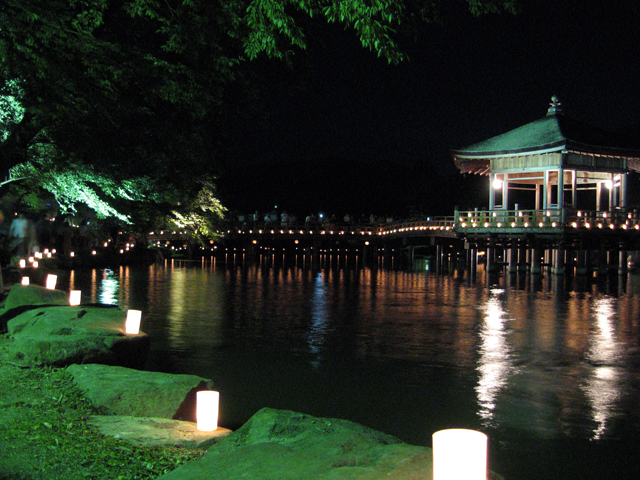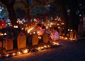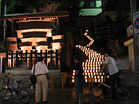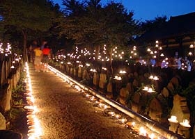 元興寺地蔵会万燈供養 http://www.kasugano.com/kankou/gangouji_jizoue/ 平成19年 8月23日(水)・24日(木) 17:30〜21:00 拝観料:無料 世界遺産でもある元興寺は平城遷都に伴い藤原京にあった日本最古の仏寺、法興寺(飛鳥寺)が移転したものです この元興寺では8月23・24日地蔵会万燈供養が行われます。 お皿の上に油と灯芯となる縄に火がつけられ石仏の前に並べられ、多くの観光客やカメラマンがここを訪れます。 23日だけは夜店も出て子供と行っても楽しめます。 本堂の智光曼荼羅の前に地蔵菩薩2体を