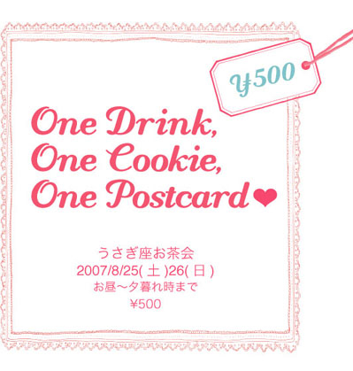 ワダショウコのショップ型展示開催中の夜猫にて イベントを開催致します。 今回、展示期間が長いのでなにかできないかなーと思って でもゆるゆるしたいなーということで お茶会を企画しました! ★★★★★★★★★★★★★★★★★★★★ 2007/8/25(土)、26(日) お昼くらいから、夕暮れ時くらいまで 1drink+1cookie+1postcard=500YEN ★★★★★★★★★★★★★★★★★★★★ 1ドリンク(冷たいハーブティ。苦手な方はおっしゃって下さい) 1クッキー(ワダ店長特製、うさクッキー) 1ポストカード(この日
