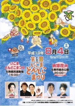 皆さんお久しぶりです! ほんとご無沙汰しておりました 去年もやりましたが、マッタリと花火を見て、 その後に居酒屋にでも行きましょうか!? 現在→僕と敬子ちゃんは決まっております。 どなたか参加する人はいてますか〜? 花火の発数は700発なので、そんなに期待しないようにね!(笑) メイン会場ではサバンナ&犬井ヒロシが来るみたいですよ。 ・・・・・・・・・・・・・・・・・・・・・・ 【詳細】 詳しくは→http://www.walkerplus.com/hanabi/kansai/detail/fw0979.html ★第6回いこまどんどこまつり納