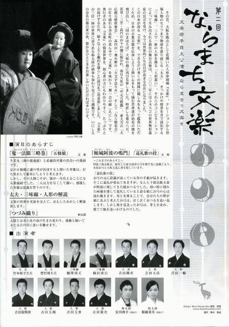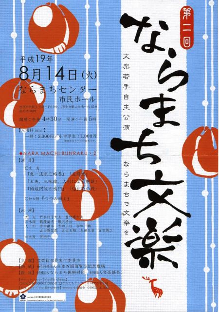 昨年に引き続いて、 文楽若手自主公演が「ならまち」で開催されます。 ************************* 「第二回 ならまち文楽」 平成19年8月14日(火) 午後四時半開場 午後五時開演 ならまちセンター市民ホール(奈良市東寺林町38番地 猿沢池南側) http://www17.ocn.ne.jp/~naramcnt/ 一般3000円 小中学生1000円 <演目> ・文楽『鬼一法眼三略巻』「五條橋」 ・太夫、三味線、人形による解説 ・文楽『傾城阿波の鳴門』「巡礼歌の段」 ・和太鼓集団「黒拍子」による奏演「大太鼓」 <出演>太夫:竹本相子大夫