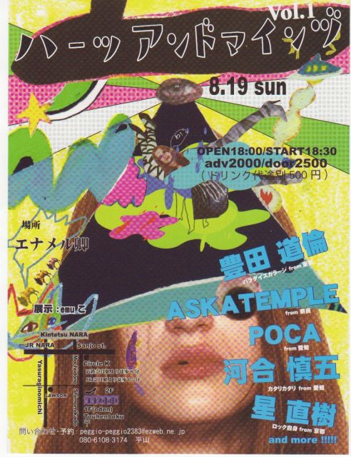 前売り2000円/当日2500円(ドリンク代別途500円) 出演 ・豊田道倫(パラダイスガラージ)from東京 http://www003.upp.so-net.ne.jp/sexy/ ・ASKATEMPLE from奈良 http://www.geocities.jp/aska_temple/ 奈良初ライブです! ・河合愼五(カタリカタリ) from愛知 Official HP 『of Rage web site』http://ofrage.cool.ne.jpライブ映像も見れます! ・POCAfrom愛知 ・星直樹(ロック自身)from京都 エルマガジンでもコラム連載中の星直樹、二回目の奈良ライブです! 問い合わせ、予約等