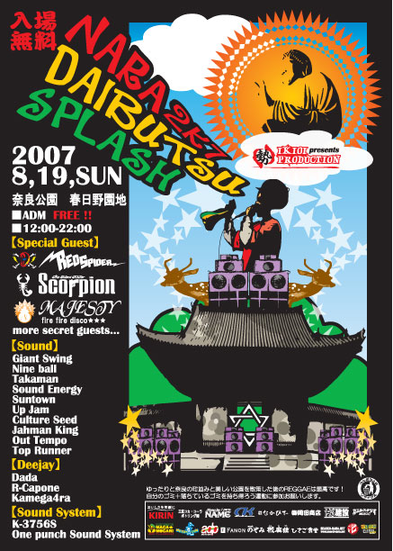 ”NARA DAIBUTU SPLASH 2k7” 2007/8/19(sun) @奈良公園(春日野園地) ADM:FREE 12:00−22:00 SPECIAL GUEST RED SPIDER/SCORPION/MAJESTY AND SECRET GUEST SOUND GIANT SWING/NINE BALL/TAKAMAN/SOUND ENERGY/SUN TOWN/
