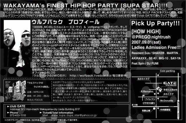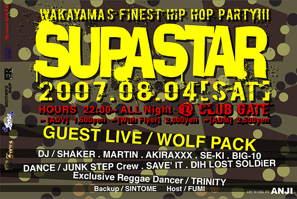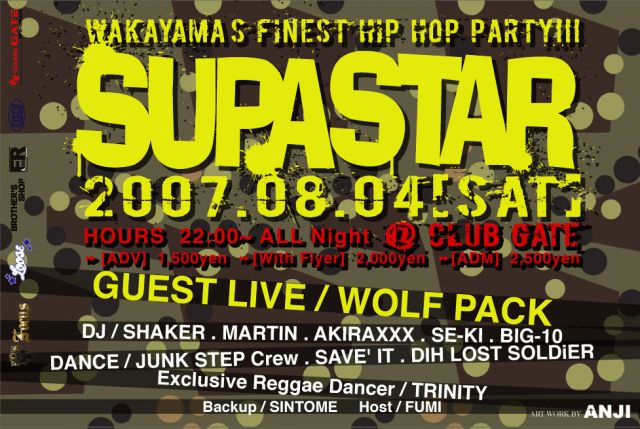 W's Finest HIP HOP PARTY!!! [SUPA STAR] 2007.08.04(sat) Guest LIVE / WOLF PACK DJ / SHAKER . MARTIN . AKIRAXXX . SE-KI . BIG-10 DANCE / JUNK STEP . SAVE'IT . DIH LOST SOLDiER Exclusive Reggae Dance / TRINITY Backup / SINTOME . Host / DJ FUMI 今回、GUESTにWOLF PACKを迎え、和歌山ReggaeシーンからTRINITYをFeat.....レギュラーメンバーもがっつしロックします!!! 楽しいPARTYにしたいので、皆さんぜひ遊びに来て下さい!! 有難う御座いました。