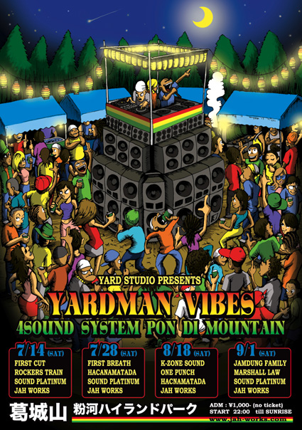 告知失礼します。 やってまいりました!! YARDMAN VIBES @ 葛城山 !!! 今年残すところあと2回となりました!! サウンドシステムが続々と山頂に集結します!!! 山々の緑に囲まれた最高の自然のシチュエーション、月明かりと満天の星空の下 繰り広げられるビックダンスまるでジャマイカにいるのでは?と思わせるほどのヤーディ体感、最高のクオリィティを誇るサウンドシステム、本場ジャマイカ仕込み!ドラム缶から煙を放つDADDY-Tのジャークチキン、各自慢のフード屋台、カセット屋、野外BARなどなど!夏の醍醐味 野外ダンスの真骨頂!