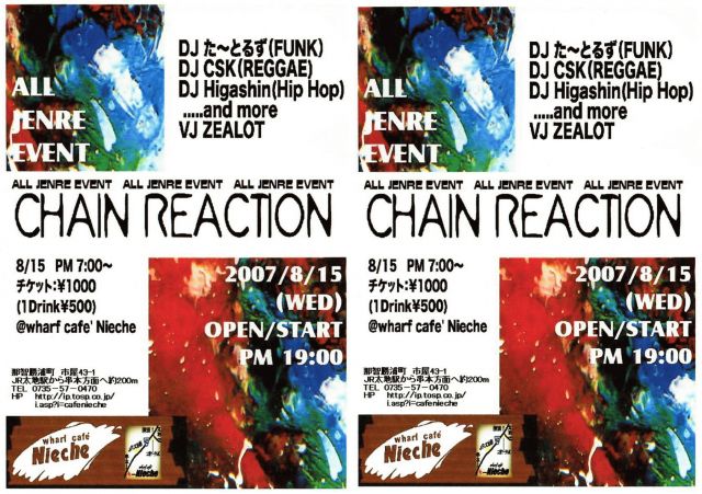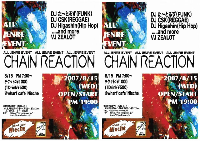 8月15日は"Nieche"クラブイベント!!! 『CHAIN REACTION @ニーチェ』 日時:8月15日(水) PM 7:00 スタート チケット:\1000 (ドリンク別) DJ: DJ た〜とるず(FUNK) DJ CSK(REGGAE) DJ Higashin(HipHop) .....and more VJ:ZEALOT 太地駅の近くにあるウチ"Nieche"でのクラブイベント、出演者の皆さんも僕達も気合い入れて演出を考えております!!! 受付に僕のお袋(串本高校食堂 経営者)が座ってます お盆 最終日、皆さんガンガン踊って楽しみましょう!!(^O^)♪