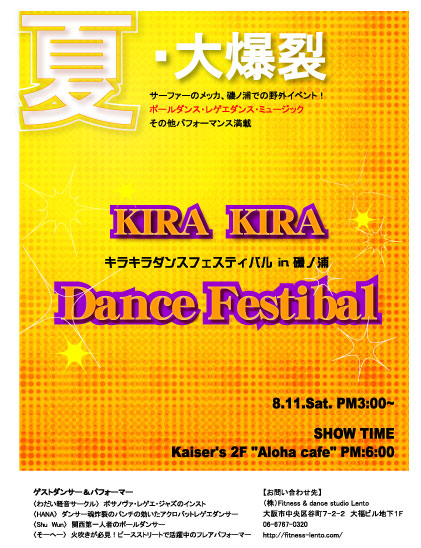夏ですね 海ですね 夏→海ときたらやっぱ、お祭りでしょ〜 てな訳で、海でイベント開催しますよ〜 今週の土曜日(8/11 15:00〜)和歌山:磯ノ浦に集まれ〜 その名も【キラキラダンスフェスティバル】・・・まぁネーミングはさておき、その内容は ポールダンス・レゲエダンス・ミュージック・火吹き等のパフォーマンスも・・・ 和歌山の磯ノ浦でお祭り騒ぎしちゃいましょ もちろん!このコミュニティの管理者こと【ちぃ】もお手伝いに行く予定です! 昼は海で遊んで、夜はみ