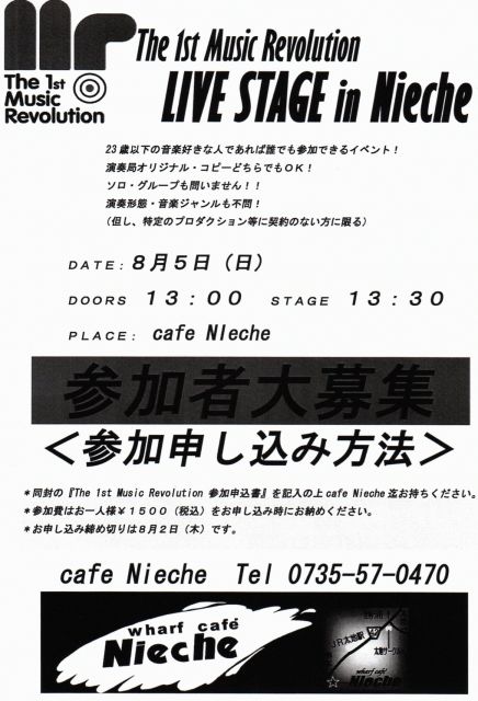 いよいよ今年も やってまいりました YAMAHAオーディション [The 1st Music Revolution] 参加者 募集STARTです 有名なYAMAHA株式会社主催、全国規模のライブイベント オーディション [The 1st Music Revolution] の和歌山県予選会場として、去年に引き続きウチ[Nieche]が選ばれました 20年続いた伝統ある有名オーディションが今年、新たにパワーアップして開催されます 参加資格は23歳以下の音楽が好きな人 演奏曲はコピー・オリジナルどちらでもOK