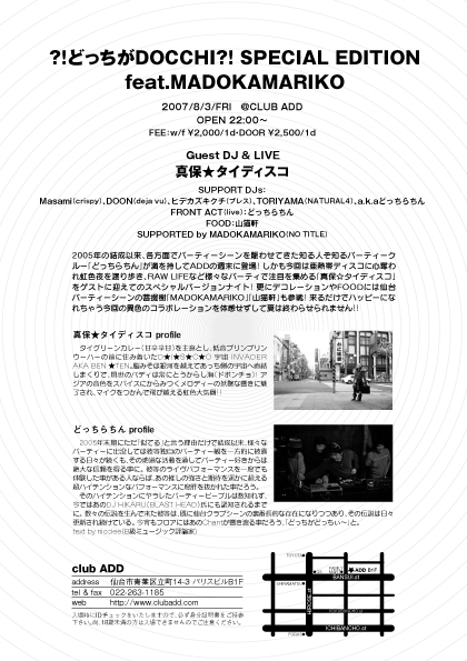 管理人様、告知失礼いたします。 先日のMONOLITHくんのイベント楽しかったです☆ 今夜はTPOとハヤシくんというすばらしいDJですね。聴きにいきたいのですが重なってしまいましたのでaddでうずうずしてます。パンゲア、ADDともに素敵な夜になりますように・・・。 いよいよ今夜です。 ********************** 『?!どっちがDOCCHI?! SPECIAL EDITION feat.MADOKAMARIKO』 2007/8/3/FRI @CLUB ADD OPEN 22:00〜 FEE:w/f \2,000/1D・DOOR \2,500/1D Guest DJ: 真保☆タイディスコ SUPPORT DJs