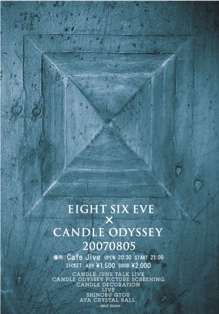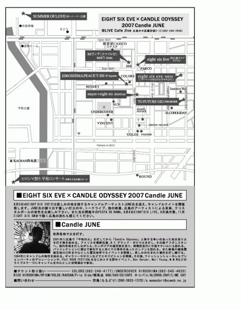 8月5日(日) EIGHT SIX EVE × CANDLE ODYSSEY 20070805 @Live Cafe Jive 広島市中区薬研堀2-13 082-246-2949 OPEN 20:30 START 21:00 TICKET ADV:\1,500- DOOR:\2,000- ・CANDLE JUNE TALK LIVE CANDLE DECORATION http://www.candlejune.jp/ ☆LIVE☆ ・燈 akari www.gallery727.com/musicjakaricentricc.htm http://www.indiesmusic.com/ItemView.aspx?id=12836 ・ガール椿 http://girlydial0017.hp.infoseek.co.jp/0017/top.html http://www.youtube.com/wat